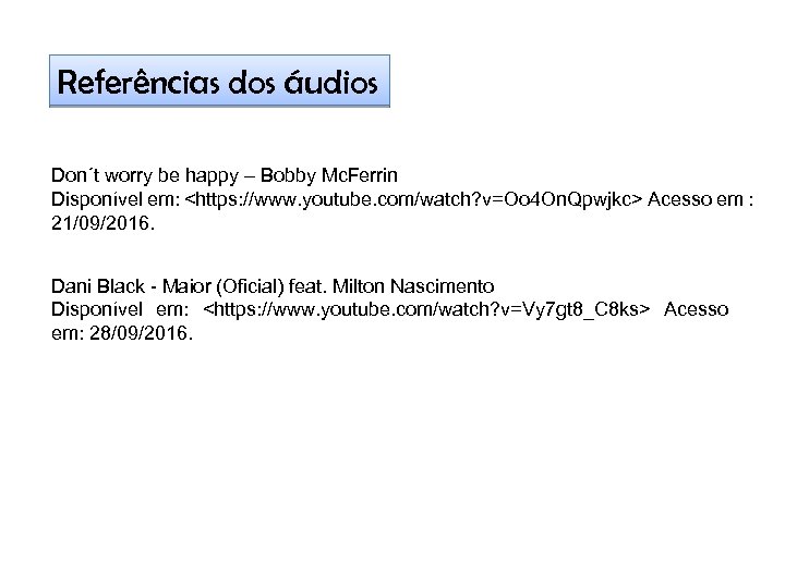 Referências dos áudios Don´t worry be happy – Bobby Mc. Ferrin Disponível em: <https: //www. youtube. com/watch? v=Oo 4 On. Qpwjkc> Acesso em : 21/09/2016. Dani Black - Maior (Oficial) feat. Milton Nascimento Disponível em: <https: //www. youtube. com/watch? v=Vy 7 gt 8_C 8 ks> Acesso em: 28/09/2016.