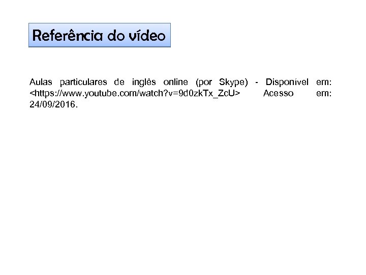 Referência do vídeo Aulas particulares de inglês online (por Skype) - Disponível em: <https: //www. youtube. com/watch? v=9 d 0 zk. Tx_Zc. U> Acesso em: 24/09/2016.