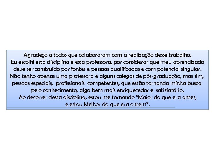 Agradeço a todos que colaboraram com a realização desse trabalho. Eu escolhi esta disciplina e esta professora, por considerar que meu aprendizado deve ser construído por fontes e pessoas qualificadas e com potencial singular. Não tenho apenas uma professora e alguns colegas de pós-graduação, mas sim, pessoas especiais, profissionais competentes, que estão tornando minha busca pelo conhecimento, algo bem mais enriquecedor e satisfatório. Ao decorrer desta disciplina, estou me tornando “Maior do que era antes, e estou Melhor do que era ontem”.