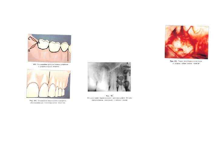 • • • • Предлагаемая нами методика хирургического лечения де¬ структивных процессов заключается в том, что при наличии качественно запломбированных корневых каналов резекция верхушек корней не проводится, а образовавшийся костный дефект заполняется остеопластическим материалом (патент России № 2116758). Хирургическое лечение обычно начинается с разреза. Од¬ нако после принятия решения о проведении хирургического вмешательства врач должен изначально понимать и заранее предвидеть возможные осложнения, связанные с выбором формы будущего разреза и отслаиваемого лоскута, то есть операция в любом случае должна начинаться с обдумывания формы и размера разреза, и только лишь затем следует про¬ водить его техническое исполнение.