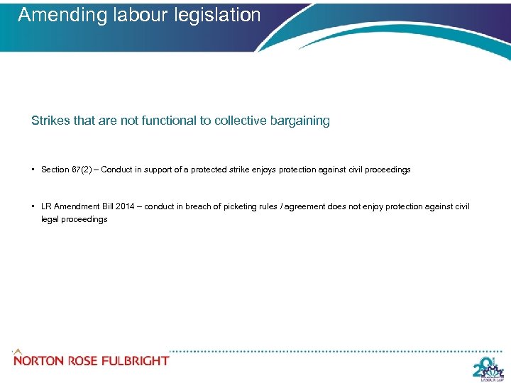 Amending labour legislation Strikes that are not functional to collective bargaining • Section 67(2) – Conduct in support of a protected strike enjoys protection against civil proceedings • LR Amendment Bill 2014 – conduct in breach of picketing rules / agreement does not enjoy protection against civil legal proceedings