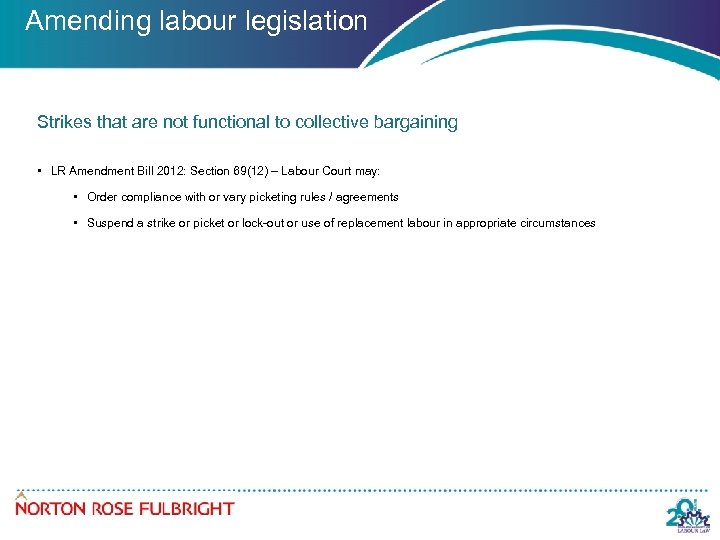 Amending labour legislation Strikes that are not functional to collective bargaining • LR Amendment Bill 2012: Section 69(12) – Labour Court may: • Order compliance with or vary picketing rules / agreements • Suspend a strike or picket or lock-out or use of replacement labour in appropriate circumstances