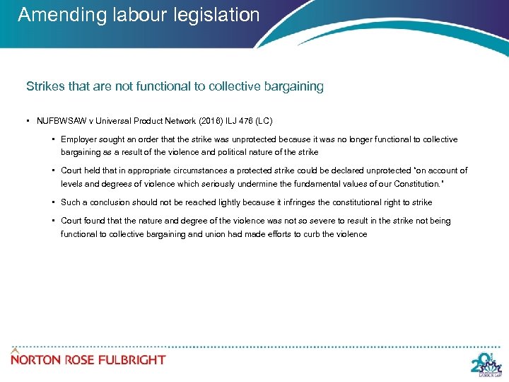 Amending labour legislation Strikes that are not functional to collective bargaining • NUFBWSAW v Universal Product Network (2016) ILJ 476 (LC) • Employer sought an order that the strike was unprotected because it was no longer functional to collective bargaining as a result of the violence and political nature of the strike • Court held that in appropriate circumstances a protected strike could be declared unprotected “on account of levels and degrees of violence which seriously undermine the fundamental values of our Constitution. ” • Such a conclusion should not be reached lightly because it infringes the constitutional right to strike • Court found that the nature and degree of the violence was not so severe to result in the strike not being functional to collective bargaining and union had made efforts to curb the violence