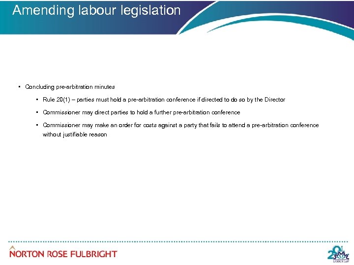 Amending labour legislation • Concluding pre-arbitration minutes • Rule 20(1) – parties must hold a pre-arbitration conference if directed to do so by the Director • Commissioner may direct parties to hold a further pre-arbitration conference • Commissioner may make an order for costs against a party that fails to attend a pre-arbitration conference without justifiable reason