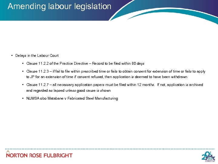 Amending labour legislation • Delays in the Labour Court • Clause 11. 2. 2 of the Practice Directive – Record to be filed within 60 days • Clause 11. 2. 3 – if fail to file within prescribed time or fails to obtain consent for extension of time or fails to apply to JP for an extension of time if consent refused, then application is deemed to have been withdrawn • Clause 11. 2. 7 – all necessary application papers must be filed within 12 months. If not, application is archived and regarded as lapsed unless good cause is shown • NUMSA obo Matabane v Fabricated Steel Manufacturing