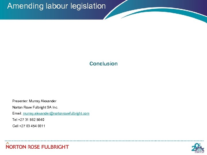 Amending labour legislation Conclusion Presenter: Murray Alexander Norton Rose Fulbright SA Inc. Email: murray. alexander@nortonrosefulbright. com Tel +27 31 582 5640 Cell +27 83 454 8811