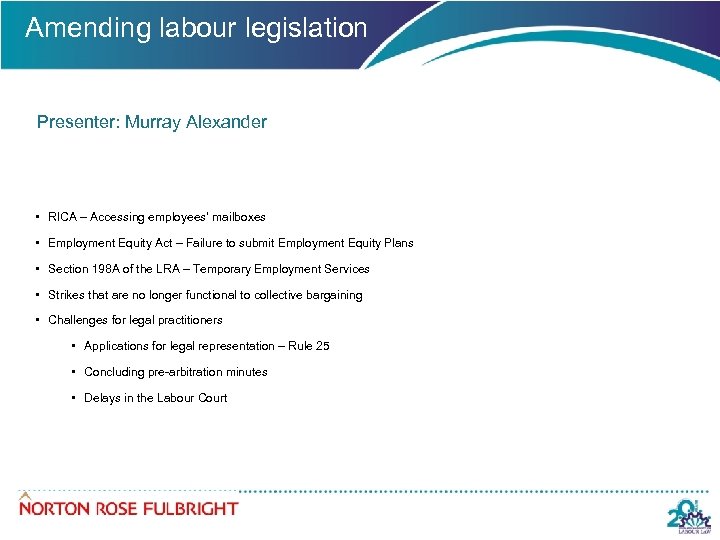 Amending labour legislation Presenter: Murray Alexander • RICA – Accessing employees’ mailboxes • Employment Equity Act – Failure to submit Employment Equity Plans • Section 198 A of the LRA – Temporary Employment Services • Strikes that are no longer functional to collective bargaining • Challenges for legal practitioners • Applications for legal representation – Rule 25 • Concluding pre-arbitration minutes • Delays in the Labour Court
