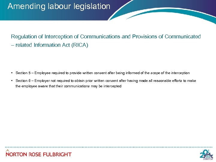 Amending labour legislation Regulation of Interception of Communications and Provisions of Communicated – related Information Act (RICA) • Section 5 – Employee required to provide written consent after being informed of the scope of the interception • Section 6 – Employer not required to obtain prior written consent after having made all reasonable efforts to make the employee aware that their communications may be intercepted