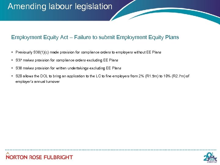 Amending labour legislation Employment Equity Act – Failure to submit Employment Equity Plans • Previously S 36(1)(c) made provision for compliance orders to employers without EE Plans • S 37 makes provision for compliance orders excluding EE Plans • S 36 makes provision for written undertakings excluding EE Plans • S 20 allows the DOL to bring an application to the LC to fine employers from 2% (R 1. 5 m) to 10% (R 2. 7 m) of employer’s annual turnover
