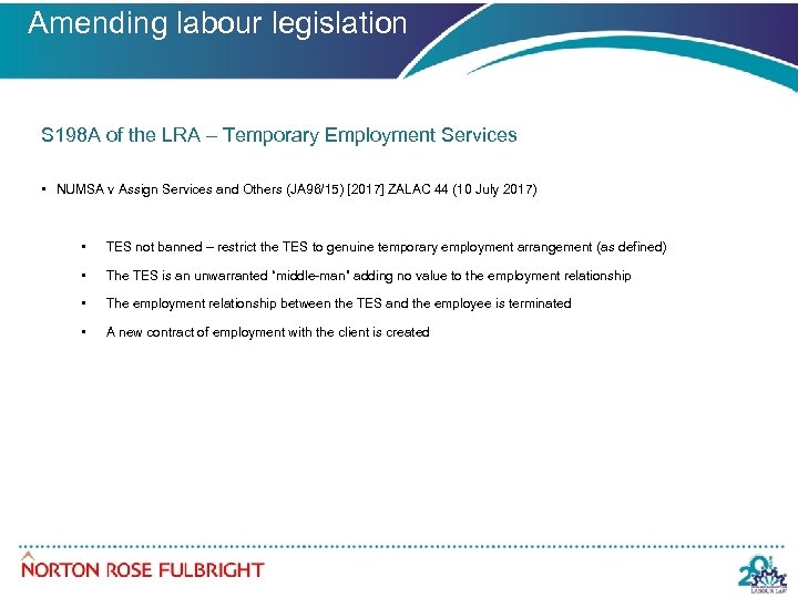 Amending labour legislation S 198 A of the LRA – Temporary Employment Services • NUMSA v Assign Services and Others (JA 96/15) [2017] ZALAC 44 (10 July 2017) • TES not banned – restrict the TES to genuine temporary employment arrangement (as defined) • The TES is an unwarranted “middle-man” adding no value to the employment relationship • The employment relationship between the TES and the employee is terminated • A new contract of employment with the client is created