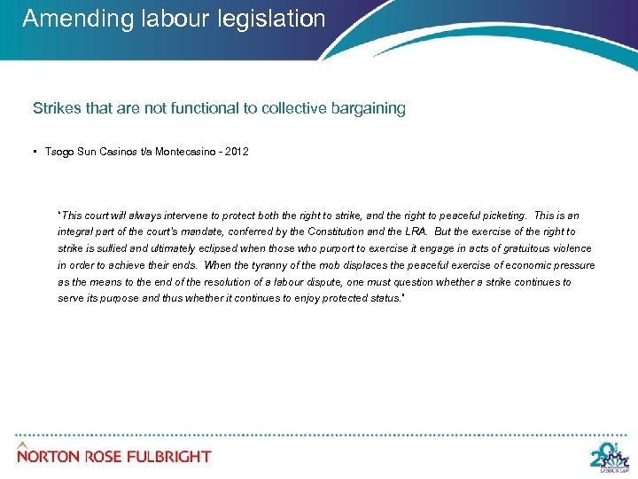 Amending labour legislation Strikes that are not functional to collective bargaining • Tsogo Sun Casinos t/a Montecasino - 2012 “This court will always intervene to protect both the right to strike, and the right to peaceful picketing. This is an integral part of the court’s mandate, conferred by the Constitution and the LRA. But the exercise of the right to strike is sullied and ultimately eclipsed when those who purport to exercise it engage in acts of gratuitous violence in order to achieve their ends. When the tyranny of the mob displaces the peaceful exercise of economic pressure as the means to the end of the resolution of a labour dispute, one must question whether a strike continues to serve its purpose and thus whether it continues to enjoy protected status. ”