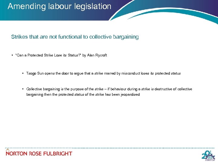 Amending labour legislation Strikes that are not functional to collective bargaining • “Can a Protected Strike Lose its Status? ” by Alan Rycroft • Tsogo Sun opens the door to argue that a strike marred by misconduct loses its protected status • Collective bargaining is the purpose of the strike – if behaviour during a strike is destructive of collective bargaining then the protected status of the strike has been jeopardised