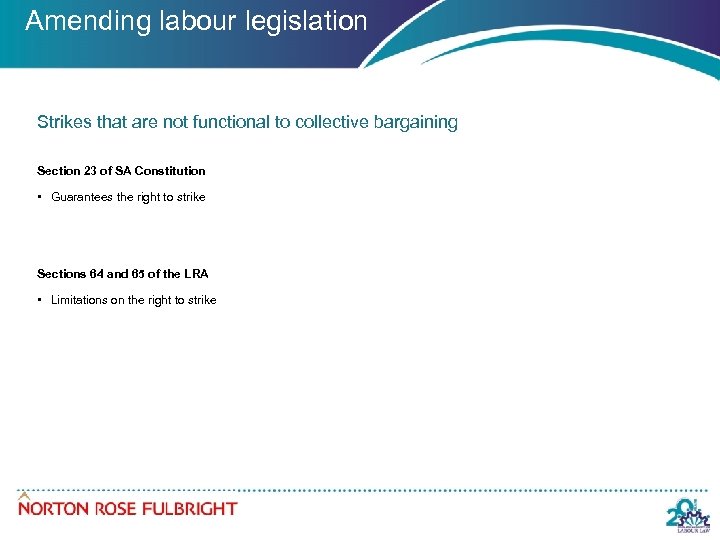 Amending labour legislation Strikes that are not functional to collective bargaining Section 23 of SA Constitution • Guarantees the right to strike Sections 64 and 65 of the LRA • Limitations on the right to strike