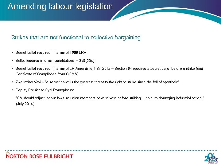 Amending labour legislation Strikes that are not functional to collective bargaining • Secret ballot required in terms of 1956 LRA • Ballot required in union constitutions – S 95(5)(p) • Secret ballot required in terms of LR Amendment Bill 2012 – Section 64 required a secret ballot before a strike (and Certificate of Compliance from CCMA) • Zwelinzina Vavi – “a secret ballot is the greatest threat to the right to strike since the fall of apartheid” • Deputy President Cyril Ramaphosa: “SA should adjust labour laws so union members have to vote before striking … to curb damaging industrial action. ” (July 2014)