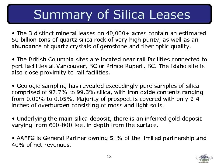 Summary of Silica Leases • The 3 distinct mineral leases on 40, 000+ acres contain an estimated 50 billion tons of quartz silica rock of very high purity, as well as an abundance of quartz crystals of gemstone and fiber optic quality. • The British Columbia sites are located near rail facilities connected to port facilities at Vancouver, BC or Prince Rupert, BC. The Idaho site is also close proximity to rail facilities. • Geologic sampling has revealed exceedingly pure samples of silica comprised of 97. 7% to 99. 3% silica, with iron oxide contents ranging from 0. 02% to 0. 05%. Majority of prospect is covered with only 2 -4 inches of overburden consisting of moss and light soils. • Underlying the main silica deposit, there is an inferred gold deposit varying from 600 -800 feet in depth from the surface. • AAFFG is General Partner owning 51% of the limited partnership and 40% of net revenues. 12