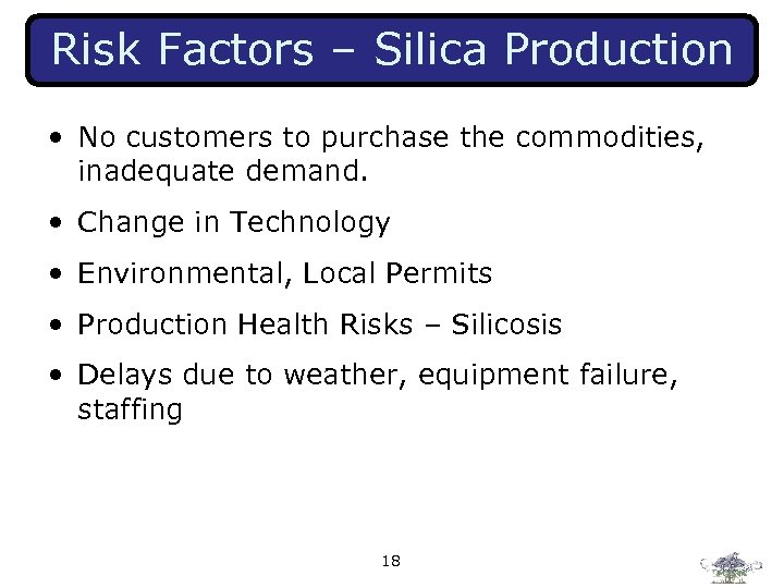 Initial Silica - Production and Pricing • 10, 000 metric tons per month mined in Year 1 from each of the 3 North American mines. Overview of pricing of silica production: • Raw decorative silica stone = $120 per ton. • OR crush and grind silica stone into granular silica = $6, 000 a ton. • OR grind granular into powder = $7, 500 a ton. • OR by heat in a refinery furnace into a gel = $6, 500 an ounce ($208, 000 a ton) 17