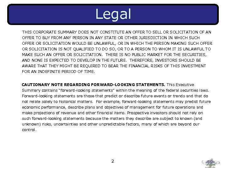 Legal THIS CORPORATE SUMMARY DOES NOT CONSTITUTE AN OFFER TO SELL OR SOLICITATION OF AN OFFER TO BUY FROM ANY PERSON IN ANY STATE OR OTHER JURISDICTION IN WHICH SUCH OFFER OR SOLICITATION WOULD BE UNLAWFUL, OR IN WHICH THE PERSON MAKING SUCH OFFER OR SOLICITATION IS NOT QUALIFIED TO DO SO, OR TO A PERSON TO WHOM IT IS UNLAWFUL TO MAKE SUCH AN OFFER OR SOLICITATION. THERE IS NO PUBLIC MARKET FOR THE SECURITIES, AND NONE IS EXPECTED TO DEVELOP IN THE FUTURE. THEREFORE, INVESTORS SHOULD BE AWARE THAT THEY MIGHT BE REQUIRED TO BEAR THE FINANCIAL RISKS OF THIS INVESTMENT FOR AN INDEFINITE PERIOD OF TIME. CAUTIONARY NOTE REGARDING FORWARD-LOOKING STATEMENTS. This Executive Summary contains “forward-looking statements” within the meaning of the federal securities laws. Forward-looking statements are those that predict or describe future events or trends and that do not relate solely to historical matters. For example, forward-looking statements may predict future economic performance, describe plans and objectives of management for future operations and make projections of revenue and other financial items. Prospective investors should not rely on such forward-looking statements because the matters they describe are subject to known (and unknown) risks, uncertainties and other unpredictable factors, many of which are beyond our control. 2