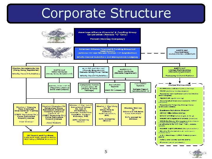 Limited Partnerships and Joint Ventures LP/JV Name Type % Owned % Revenue Description Card LP Silica 51% 35% 18 billion tons Card LP Gold 51% 35% 7 million ounces Arco Hills LP Silica 51% 40% 20 billion tons $2, 400, 000, 000 Crow Claims Silica 51% 40% 18 billion tons $2, 160, 000, 000 Appleman LP Gold, Silver, Platinum, Palladium, Iridium 51% 40% 50 million tons mineral deposits Aces Oil 100% 58% 140 million ~ 1. 94 billion barrels Ecco Drilling LP Oil Driller 70% 80% Bosonda LP Water/LPG 51% 80% Wealth Management LP Finance 51% 80% Business Solutions LP Finance 51% 80% Tote International LP Technology 51% 30% WMG Software LP Commodities Exchange 75% 74% Shintoc -Yige JV Oil Refinery 80% 50% Boardwalk Property LP Emeralds/ Property 51% 30% 175, 000 oz. Composite Power JV Gold/Metal Tailings 51% 40 million tons Silica China Hubei JV Silica 51% 50% Need A Parts Automotive 51% 10 -25% 51% 40% Golden Light Studios Entertainment A&J Holdings Power Plant 51% 40% Premier Wood Products 85% ASG Power Plant 51% 40% Shintoc-SAJ JV Commodities 51% 40% Accelerated Communications Technology 51% 40% 7 700 million tons Valuation $2, 160, 000, 000 $3, 500, 000 $851, 000, 000 $7, 000, 000