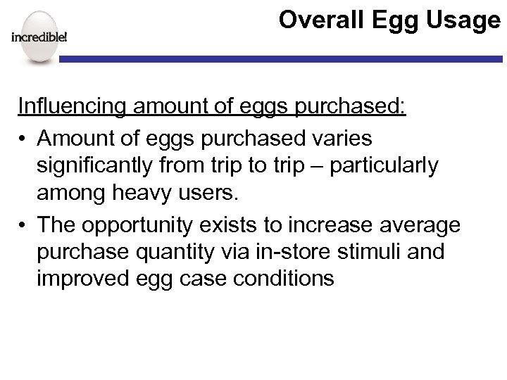 Overall Egg Usage Influencing amount of eggs purchased: • Amount of eggs purchased varies significantly from trip to trip – particularly among heavy users. • The opportunity exists to increase average purchase quantity via in-store stimuli and improved egg case conditions