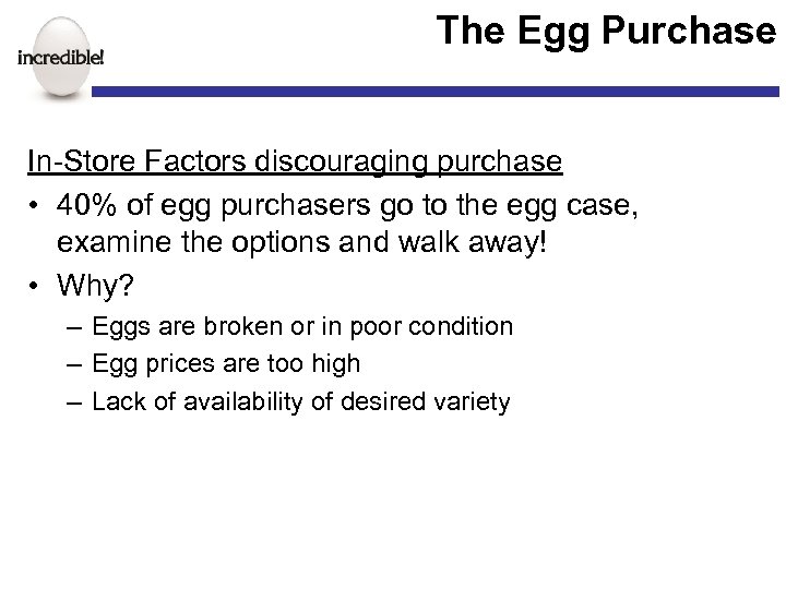 The Egg Purchase In-Store Factors discouraging purchase • 40% of egg purchasers go to the egg case, examine the options and walk away! • Why? – Eggs are broken or in poor condition – Egg prices are too high – Lack of availability of desired variety