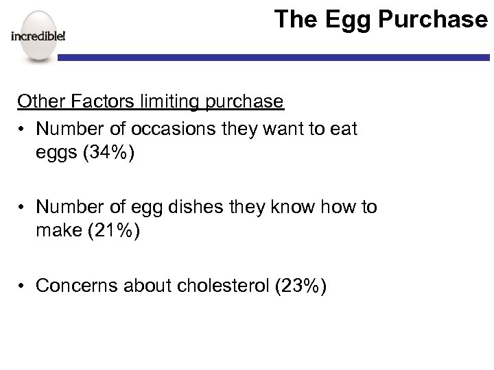 The Egg Purchase Other Factors limiting purchase • Number of occasions they want to eat eggs (34%) • Number of egg dishes they know how to make (21%) • Concerns about cholesterol (23%)