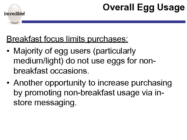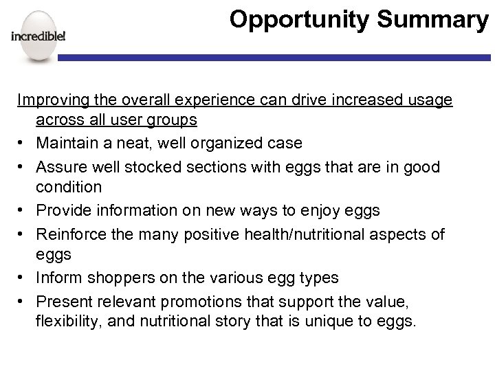 Opportunity Summary Improving the overall experience can drive increased usage across all user groups • Maintain a neat, well organized case • Assure well stocked sections with eggs that are in good condition • Provide information on new ways to enjoy eggs • Reinforce the many positive health/nutritional aspects of eggs • Inform shoppers on the various egg types • Present relevant promotions that support the value, flexibility, and nutritional story that is unique to eggs.
