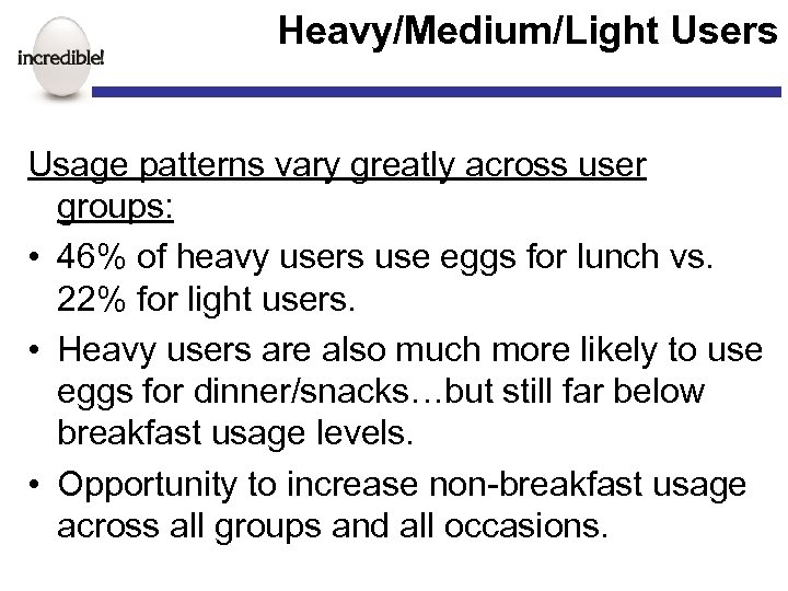 Heavy/Medium/Light Users Usage patterns vary greatly across user groups: • 46% of heavy users use eggs for lunch vs. 22% for light users. • Heavy users are also much more likely to use eggs for dinner/snacks…but still far below breakfast usage levels. • Opportunity to increase non-breakfast usage across all groups and all occasions.