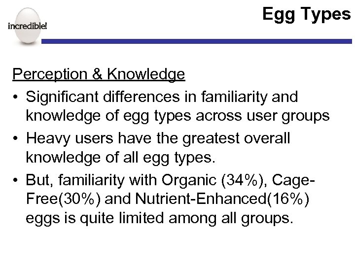 Egg Types Perception & Knowledge • Significant differences in familiarity and knowledge of egg types across user groups • Heavy users have the greatest overall knowledge of all egg types. • But, familiarity with Organic (34%), Cage. Free(30%) and Nutrient-Enhanced(16%) eggs is quite limited among all groups.