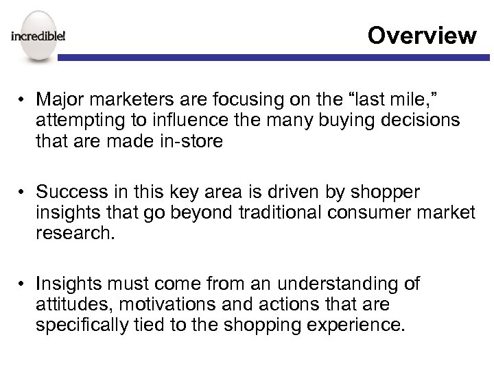 Overview • Major marketers are focusing on the “last mile, ” attempting to influence the many buying decisions that are made in-store • Success in this key area is driven by shopper insights that go beyond traditional consumer market research. • Insights must come from an understanding of attitudes, motivations and actions that are specifically tied to the shopping experience.