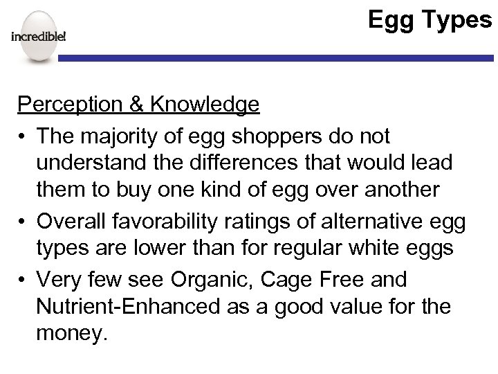 The Egg Purchase Impact of the egg case • The egg case is perceived as easy to shop • The number of product choices is viewed as appropriate • However, there are many opportunities to improve: – 25 -30% are confused about the differences in egg types and options – Poor egg condition dissuades a significant number of purchases – Light/medium users are less likely to enjoy the egg purchase experience