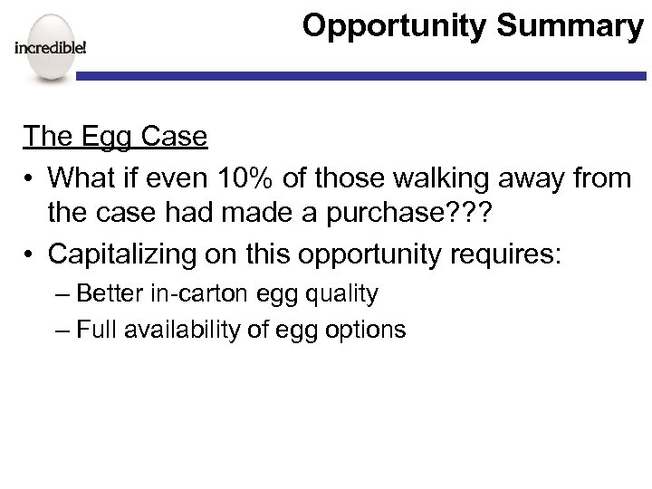 Opportunity Summary The Egg Case • What if even 10% of those walking away from the case had made a purchase? ? ? • Capitalizing on this opportunity requires: – Better in-carton egg quality – Full availability of egg options