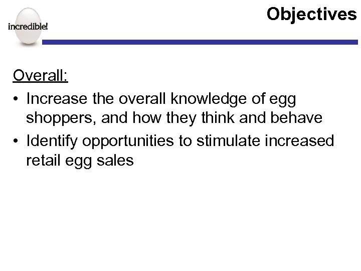 Objectives Overall: • Increase the overall knowledge of egg shoppers, and how they think and behave • Identify opportunities to stimulate increased retail egg sales