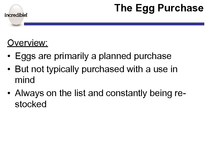 The Egg Purchase Overview: • Eggs are primarily a planned purchase • But not typically purchased with a use in mind • Always on the list and constantly being restocked
