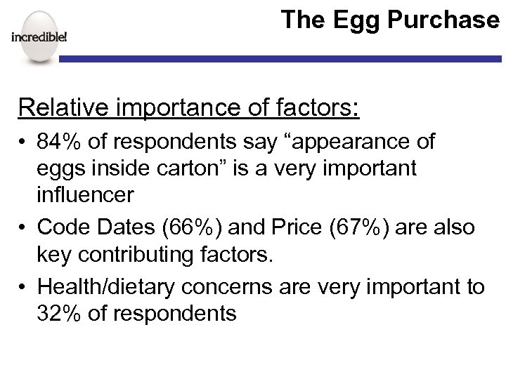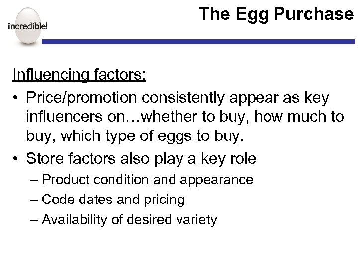 The Egg Purchase Influencing factors: • Price/promotion consistently appear as key influencers on…whether to buy, how much to buy, which type of eggs to buy. • Store factors also play a key role – Product condition and appearance – Code dates and pricing – Availability of desired variety