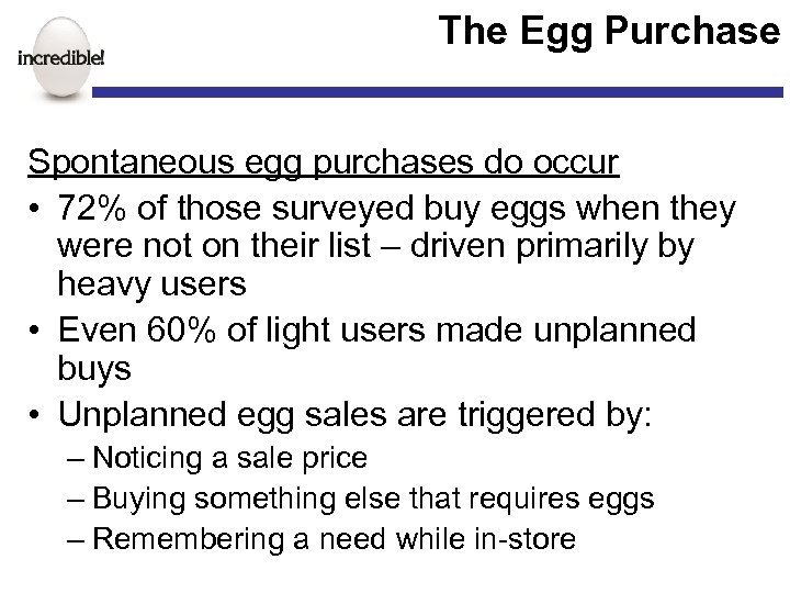 The Egg Purchase Spontaneous egg purchases do occur • 72% of those surveyed buy eggs when they were not on their list – driven primarily by heavy users • Even 60% of light users made unplanned buys • Unplanned egg sales are triggered by: – Noticing a sale price – Buying something else that requires eggs – Remembering a need while in-store
