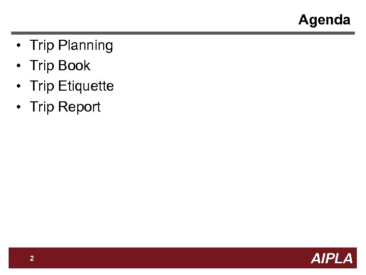 Agenda • • Trip Planning Trip Book Trip Etiquette Trip Report Firm Logo 2 AIPLA