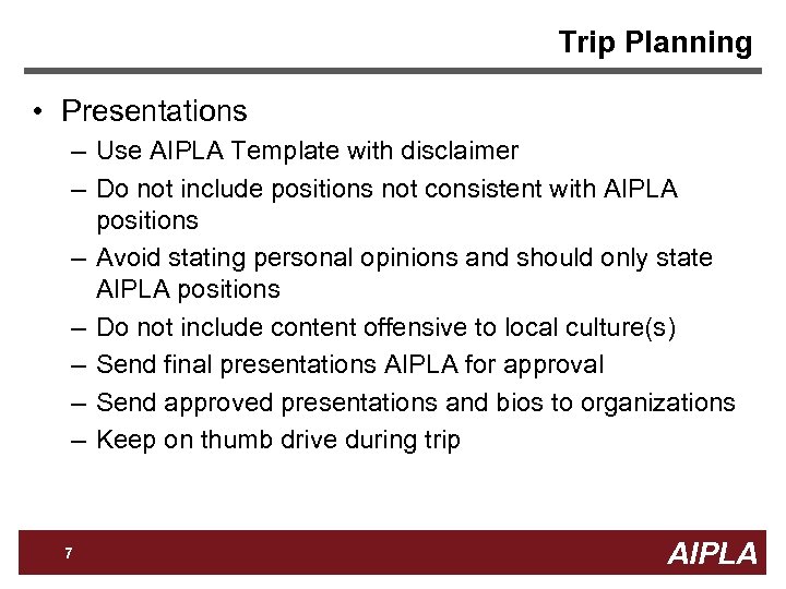 Trip Planning • Programming – Propose topics of interest to foreign organizations • Prosecution/litigation/trademark • Case law updates • Local development – Each meeting limited to 25 delegates – Plan networking breakfast/dinner/reception • Determine in advance who pays (delegates, foreign organization, etc. ) – Allow leadership meeting time formally/informally – Speaker selection Firm Logo – Group call before trip to discuss logistics & update AIPLA leadership on issues 6 AIPLA