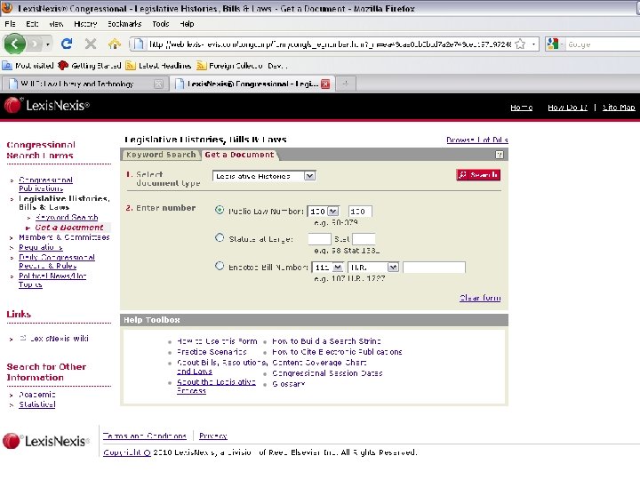 Full Text Legislative Histories • Search the online catalog to find compiled legislative histories held by the library • Hein. Online, “U. S. Federal Legislative History Library” • Westlaw Directory Location: All Databases > U. S. Federal Materials > Legislative History • Lexis. Nexis: Legal Tab> Legislation & Politics - U. S. & U. K. > U. S. Congress > Legislative Histories