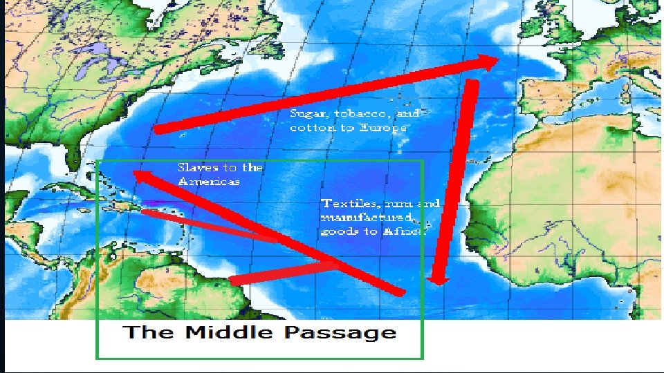 MIDDLE PASSAGE • Part of triangular trade in which African slaves were shipped to the New World • Slave traders wanted to deliver a large and healthy cargo • The sick were thrown overboard to keep disease from spreading