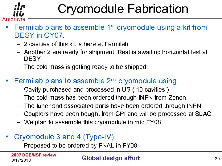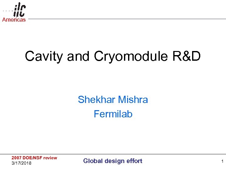 Americas Cavity and Cryomodule R&D Shekhar Mishra Fermilab 2007 DOE/NSF review 3/17/2018 Global design effort 1