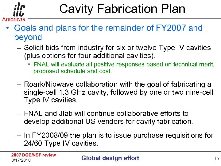 Cavity Fabrication & Industry Development Americas • Purchase orders were issued for fourteen additional Type IV cavities, six from AES and eight from ACCEL. – ACCEL has acquired all necessary material and has shipped the halfcell blanks to FNAL for eddy current scanning. – Material for AES is currently in Inspection at FNAL to verify conformance with the FNAL niobium specification. • Delivery date for these cavities is projected to be during the fourth quarter of FY 2007. • First step toward developing additional US Cavity vendors for cavity fabrication, – Phase I of multi-phase program is funded with Roark Engineering. Roark is building three 3. 9 GHz single-cell cavities to develop expertise in niobium machining, forming and EB welding. Tooling forming the half-cells was provided by FNAL. – Fermilab is working with Roark and Niowave in developing a collaborative venture 2007 DOE/NSF review 3/17/2018 Global design effort 9