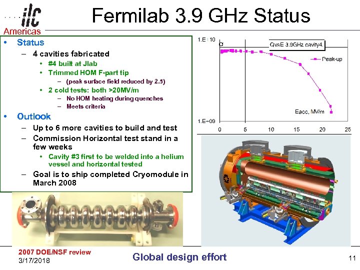 Cavity Fabrication Plan Americas • Goals and plans for the remainder of FY 2007 and beyond – Solicit bids from industry for six or twelve Type IV cavities (plus options for four additional cavities). • FNAL will evaluate all positive responses based on technical merit, proposed schedule and cost. – Roark/Niowave collaboration with the goal of fabricating a single-cell 1. 3 GHz cavity, followed by one or two nine-cell Type IV cavities. – FNAL and Jlab will continue collaborative efforts to develop additional US vendors for cavity fabrication. – In FY 2008/09 the plan is to issue purchase requisitions for 24/60 Type IV cavities. 2007 DOE/NSF review 3/17/2018 Global design effort 10