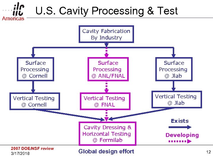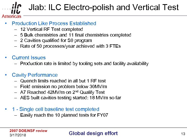 Americas U. S. Cavity Processing & Test Cavity Fabrication By Industry Surface Processing @ Cornell Vertical Testing @ Cornell Surface Processing @ ANL/FNAL Vertical Testing @ FNAL Cavity Dressing & Horizontal Testing @ Fermilab 2007 DOE/NSF review 3/17/2018 Global design effort Surface Processing @ Jlab Vertical Testing @ Jlab Exists Developing 12