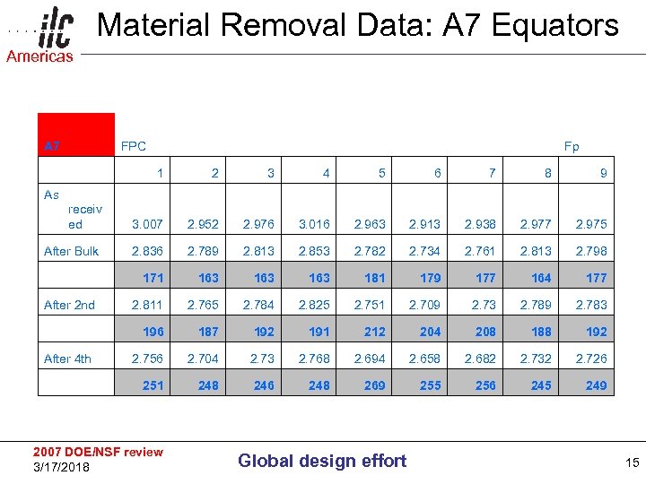 Results of Accel Cavity: A 7 Americas 2007 DOE/NSF review 3/17/2018 Global design effort 14