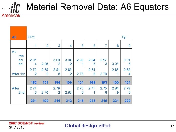 Material Removal Data: A 7 Equators Americas A 7 FPC Fp 1 2 3 4 5 6 7 8 9 receiv ed 3. 007 2. 952 2. 976 3. 016 2. 963 2. 913 2. 938 2. 977 2. 975 After Bulk 2. 836 2. 789 2. 813 2. 853 2. 782 2. 734 2. 761 2. 813 2. 798 171 163 163 181 179 177 164 177 2. 811 2. 765 2. 784 2. 825 2. 751 2. 709 2. 73 2. 789 2. 783 196 187 192 191 212 204 208 188 192 2. 756 2. 704 2. 73 2. 768 2. 694 2. 658 2. 682 2. 732 2. 726 251 248 246 248 269 255 256 245 249 As After 2 nd After 4 th 2007 DOE/NSF review 3/17/2018 Global design effort 15