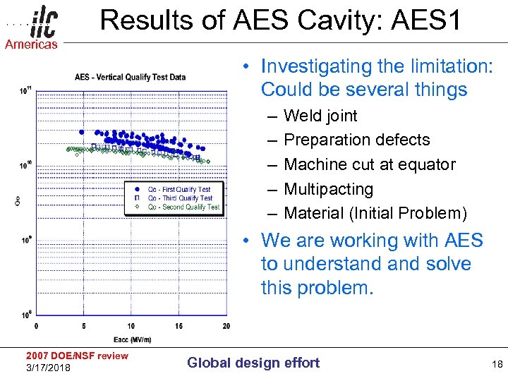 Results of AES Cavity: AES 1 Americas • Investigating the limitation: Could be several things – – – Weld joint Preparation defects Machine cut at equator Multipacting Material (Initial Problem) • We are working with AES to understand solve this problem. 2007 DOE/NSF review 3/17/2018 Global design effort 18