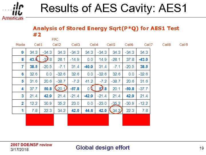 Results of AES Cavity: AES 1 Americas Analysis of Stored Energy Sqrt(P*Q) for AES 1 Test #2 Mode FPC Cell 2 Cell 1 Cell 3 Cell 4 Cell 5 Cell 6 Cell 7 9 34. 3 -34. 3 43. 0 -37. 8 28. 1 -14. 9 0. 0 14. 9 -28. 1 37. 8 -43. 0 7 38. 5 -20. 5 -7. 1 31. 4 -40. 9 31. 4 -7. 1 -20. 5 38. 5 6 32. 6 0. 0 -32. 6 5 31. 6 20. 6 -38. 7 -7. 2 41. 2 -7. 2 -38. 7 20. 6 31. 6 4 37. 7 50. 8 -20. 1 -57. 8 0. 0 57. 8 20. 1 -50. 8 -37. 7 3 21. 4 42. 9 21. 4 -42. 9 -21. 4 42. 9 21. 4 2 12. 2 30. 9 35. 2 23. 0 0. 0 -23. 0 -35. 2 -30. 9 -12. 2 1 7. 8 22. 3 34. 2 42. 0 44. 6 42. 0 34. 2 22. 3 Cell 9 34. 3 8 Cell 8 7. 8 2007 DOE/NSF review 3/17/2018 Global design effort 19