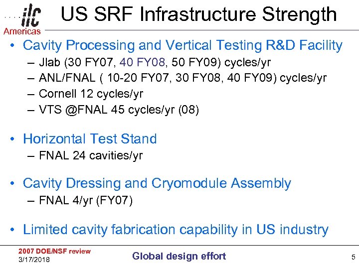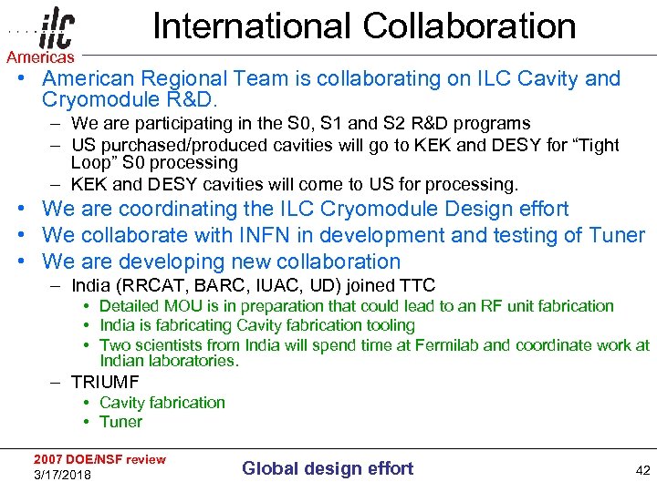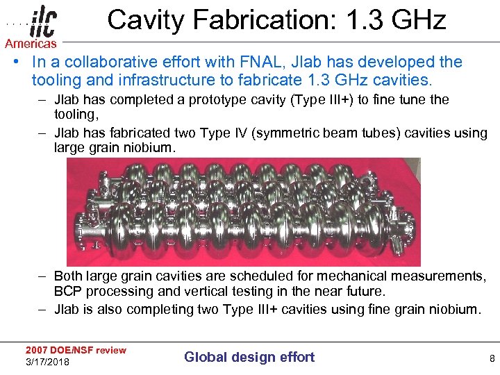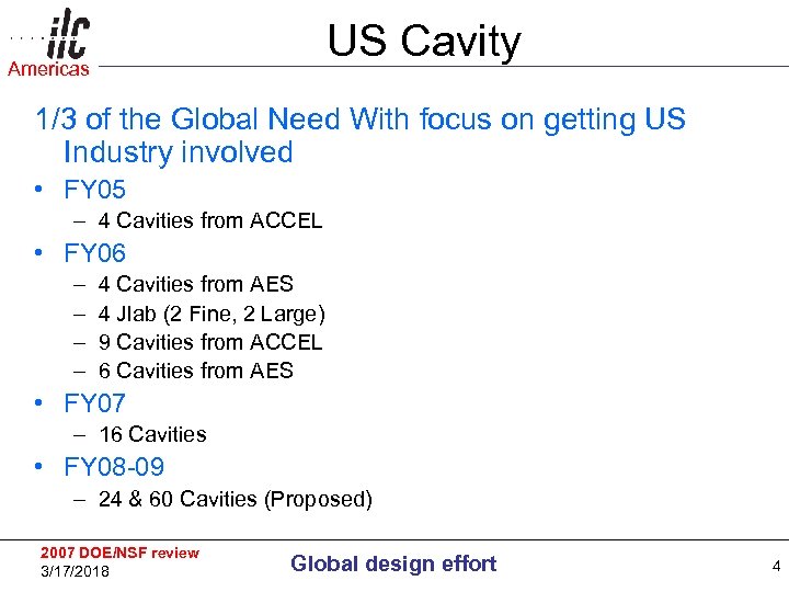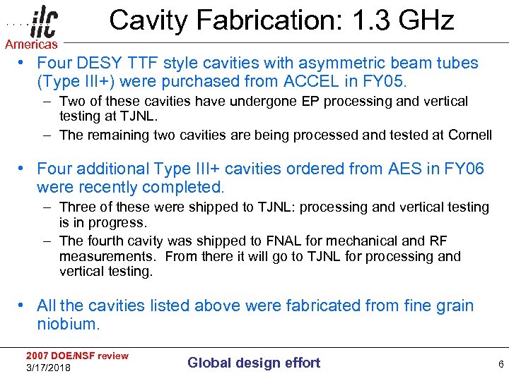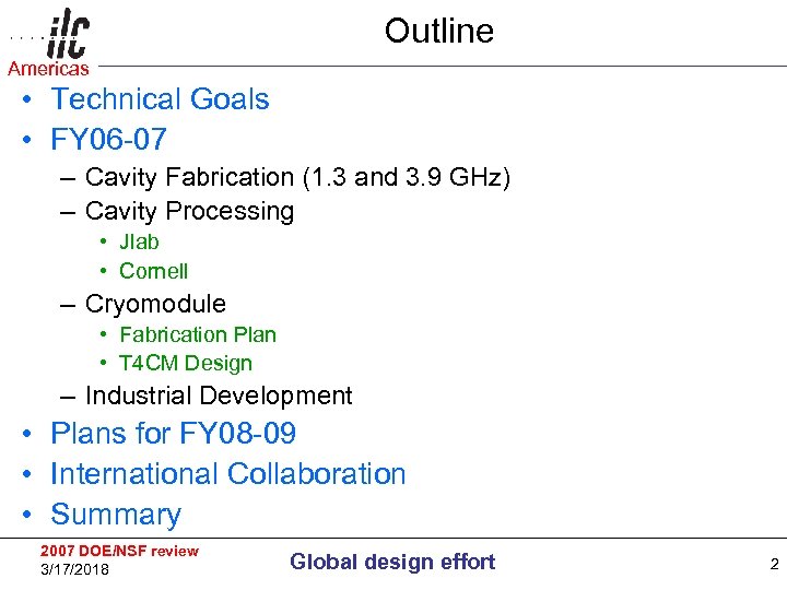 Outline Americas • Technical Goals • FY 06 -07 – Cavity Fabrication (1. 3 and 3. 9 GHz) – Cavity Processing • Jlab • Cornell – Cryomodule • Fabrication Plan • T 4 CM Design – Industrial Development • Plans for FY 08 -09 • International Collaboration • Summary 2007 DOE/NSF review 3/17/2018 Global design effort 2