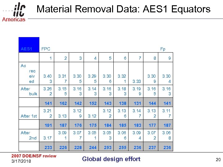 Material Removal Data: A 6 Equators Americas A 6 FPC Fp 1 2 3 4 5 6 7 8 9 2. 97 4 2. 95 3. 00 2 3. 04 2 2. 92 1 2. 94 6 2. 97 3 3. 07 3. 01 5 After 1 st 2. 79 2 2. 78 9 2. 81 8 2. 85 2 2. 73 2. 74 8 2. 78 2. 87 1 2. 82 4 182 161 184 190 191 198 193 199 191 After 2 nd 2. 77 3 2. 76 2. 79 2 2. 83 2. 70 6 2. 71 1 2. 75 8 2. 84 9 2. 79 5 201 190 212 215 235 215 221 220 As rec eiv ed 2007 DOE/NSF review 3/17/2018 Global design effort 17