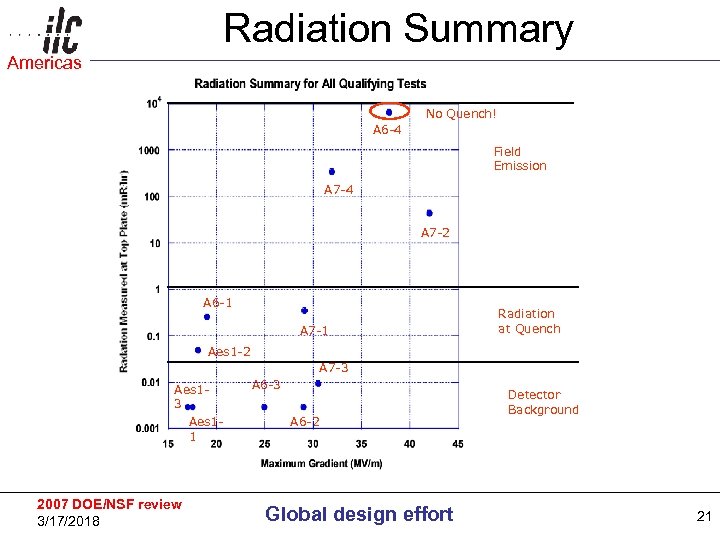 Radiation Summary Americas No Quench! A 6 -4 Field Emission A 7 -4 A 7 -2 A 6 -1 A 7 -1 Radiation at Quench Aes 1 -2 A 7 -3 Aes 11 2007 DOE/NSF review 3/17/2018 A 6 -3 A 6 -2 Global design effort Detector Background 21